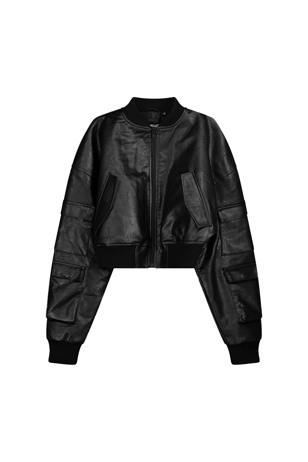 מעיל בומבר בעיצוב יוקרתי מעור טבעוני כבד עם בטנה מבודדת. משלב פונקציונליות ונוכחות עם לוגואים בולטים ועיצוב אוברסייז עוצמתי.
